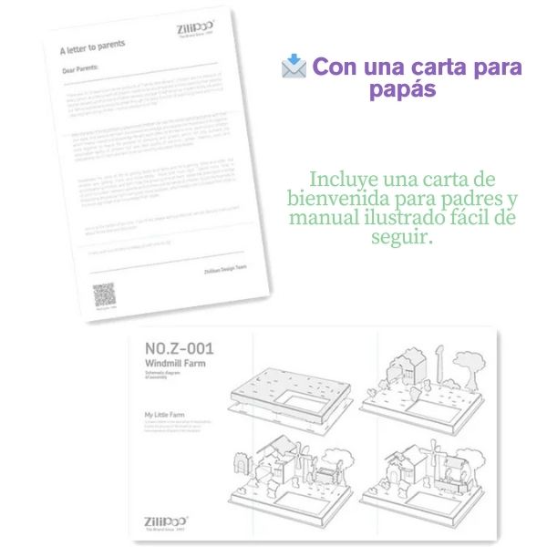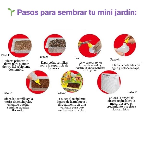 Cada casita incluye las piezas para armar la miniatura 3D, una bolsita de tierra (100 g aprox.), una variedad de semillas, un instructivo de armado, y una guía ilustrada para el proceso de siembra.